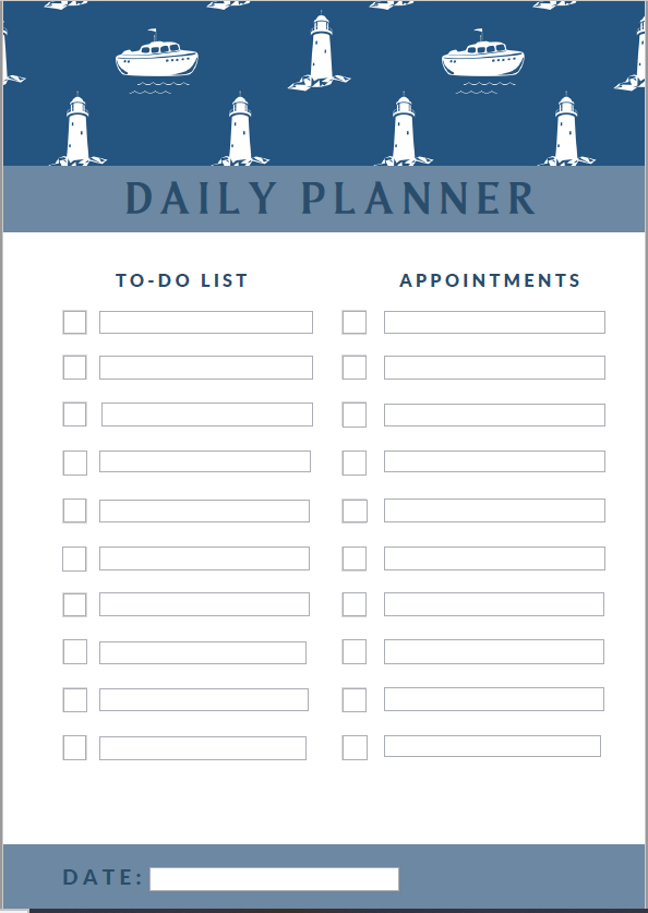 This is daily planner has a nautical theme. It is in pdf format and can be filled in electronically and reused. You also have the option to print it should you wish to do so.