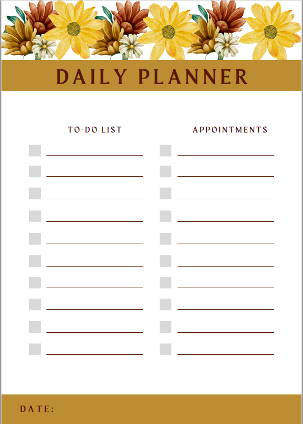 This daily planner with floral design is in pdf format. You can save it to your computer and print it as many times as you wish.